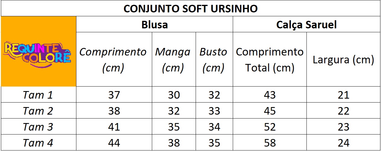 Calça: Modelo saruel (com gancho baixo) para acomodar a fralda confortavelmente, cós elástico com cordão decorativo e punhos nos tornozelos.
